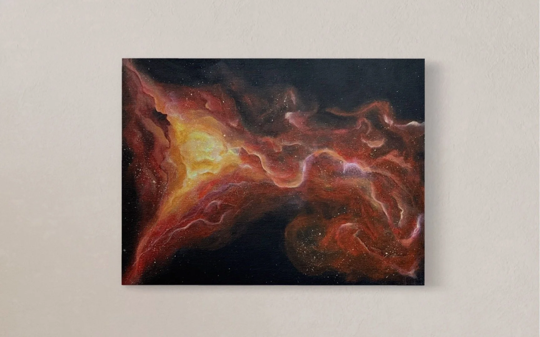 Own this fiery tribute to the universe’s breathing chaos, and let its energy ignite your imagination every time you gaze upon it. Surrounding it’s luminous epicenter is a cascade of swirling red, orange, and dusty crimson hues, creating the illusion of celestial smoke and ash drifting across the void of space. Immerse yourself in the fiery brilliance of Supernova Ember, a cosmic masterpiece that captures the raw power and beauty of a star’s final eruption.